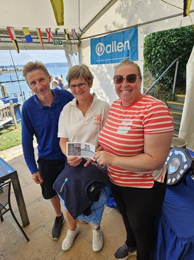 - Third place – John Clementson and Mel Titmus, with MYC Commodore Catherine Gore. (Credit Philip Clarabut).