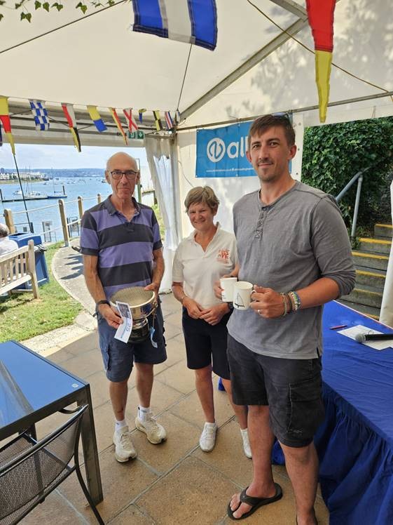 - Third place – John Clementson and Mel Titmus, with MYC Commodore Catherine Gore. (Credit Philip Clarabut).