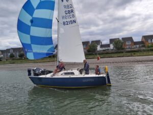 The downriver leg was a gyber’s paradise—zigs, zags, and a few questionable angles. The fleet danced past the forts before turning for home. Red Dwarf, now free from her early penalty, surged into third, while Skipper, freshly un-mudded, followed in fourth. Screwloose, trailing but tenacious, brought up the rear with admirable spirit and a drizzle cake consolation prize.